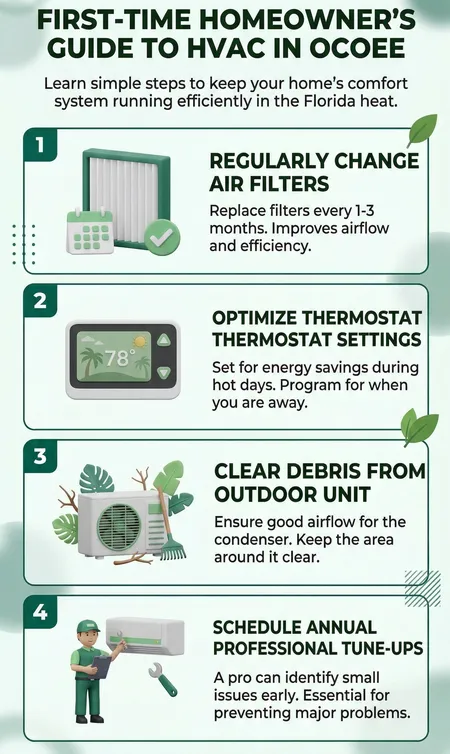 Schedule two professional HVAC tune-ups per year — spring and fall. This is the single highest-ROI maintenance habit for Ocoee homeowners.